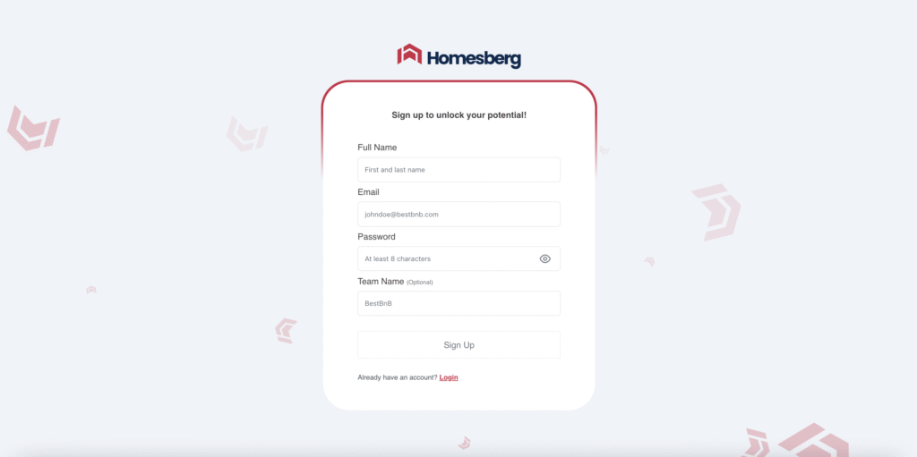 Step 1 – Sign up for the Homesberg application at app.homesberg.com.