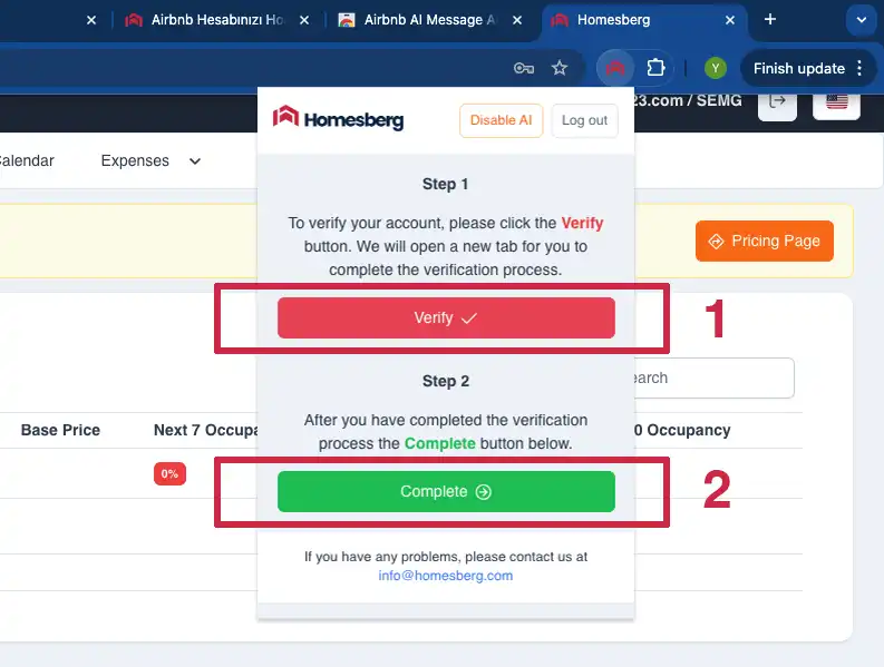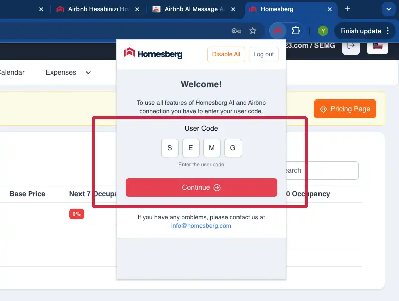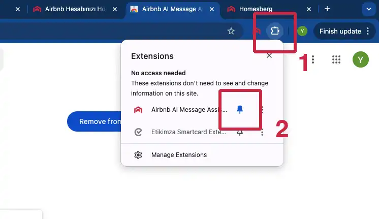 Step 7 – Pin the Homesberg extension on the Airbnb page where you are logged in. You can access the extension menu from the “puzzle piece” icon in the top right corner of your browser.